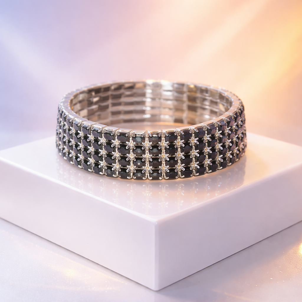 Three rows of black gemstones on a stretch bracelet. One size fits most.