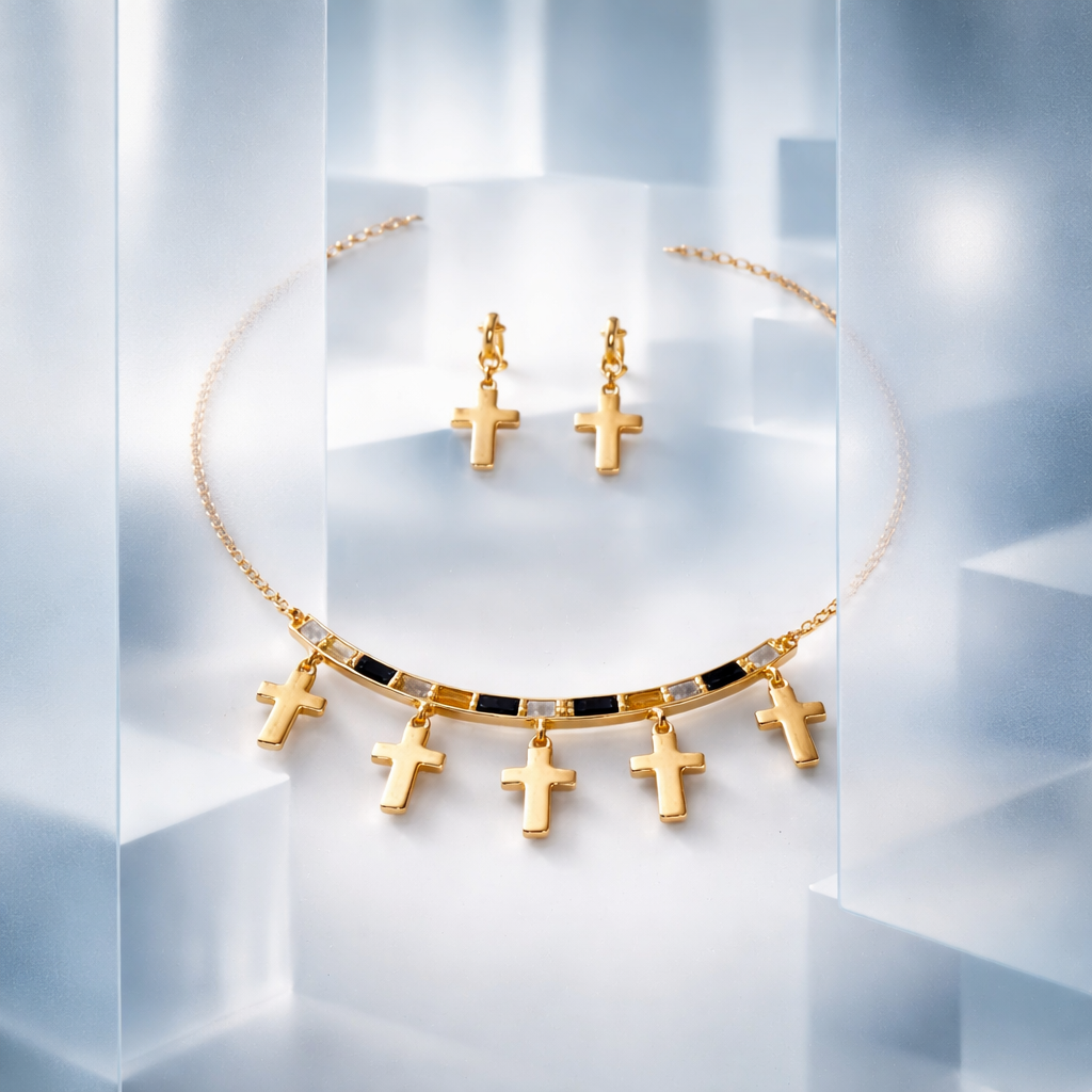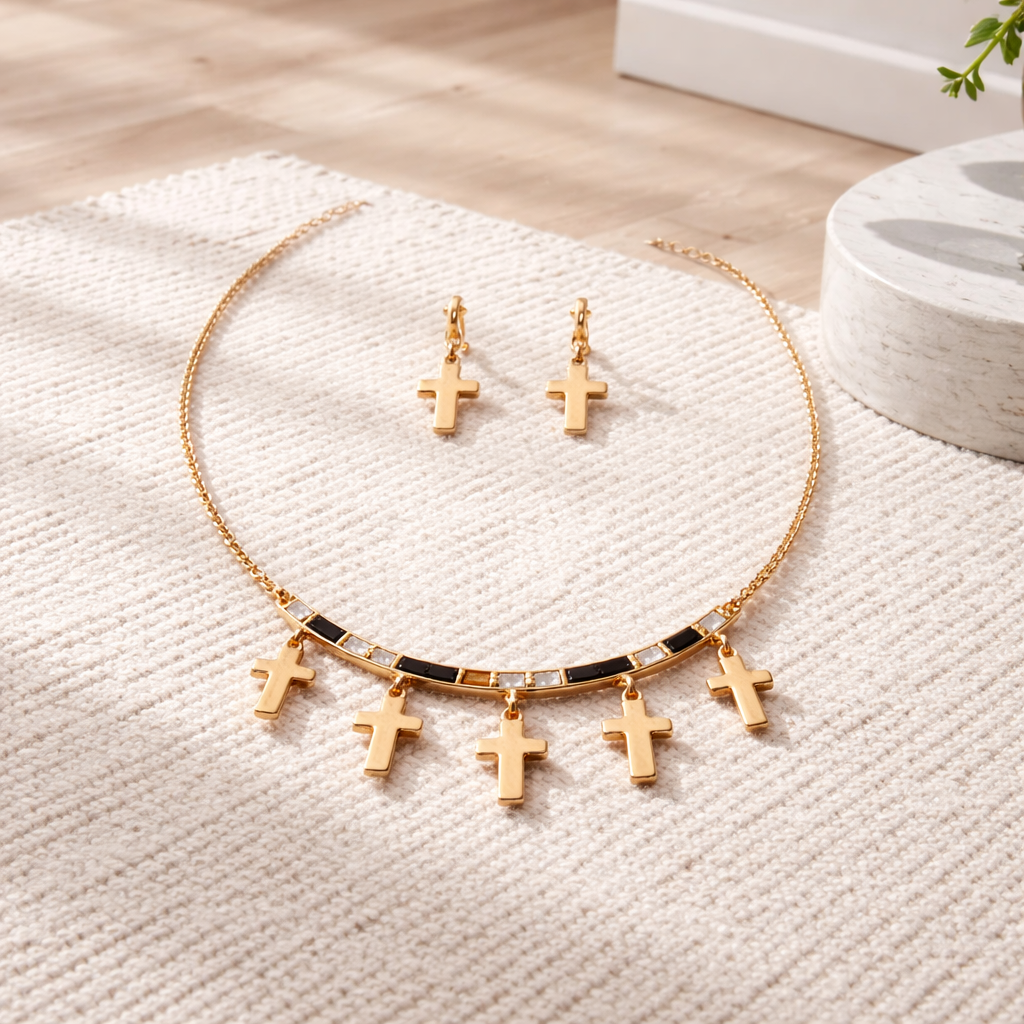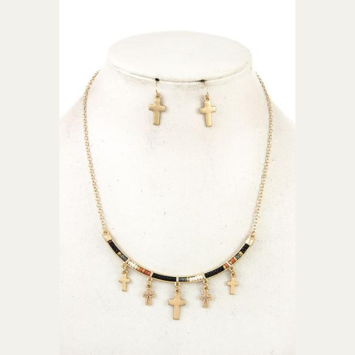 CURVED BEAD CROSS DANGLE NECKLACE SET