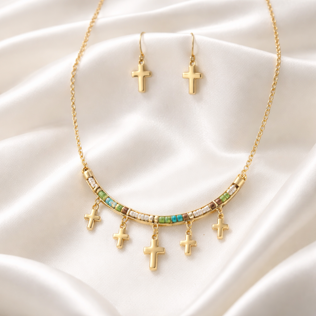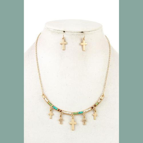 CURVED BEAD CROSS DANGLE NECKLACE SET