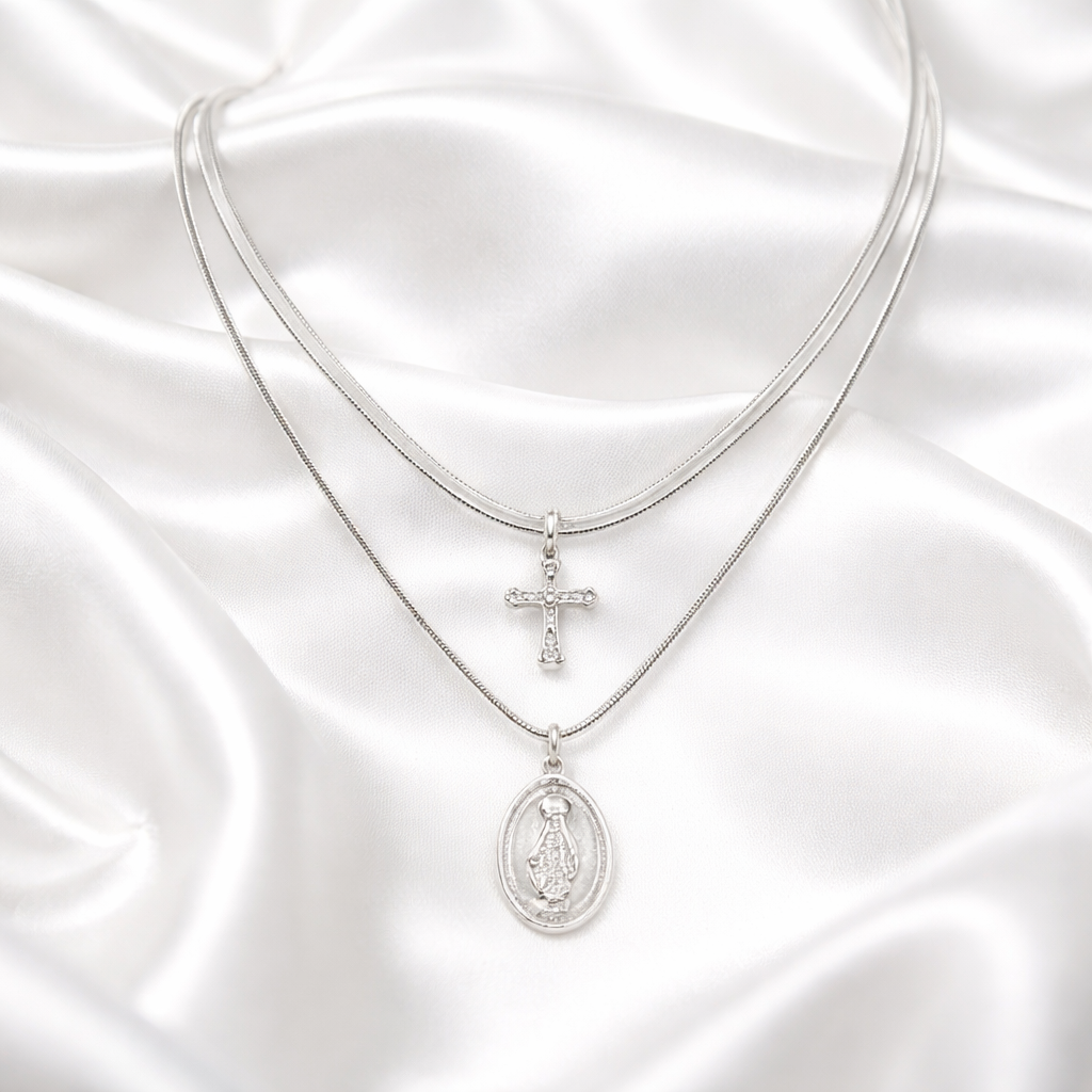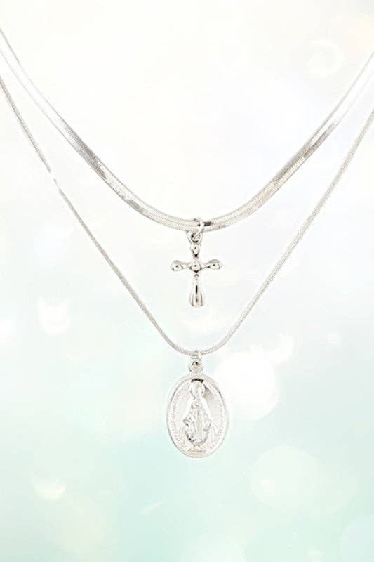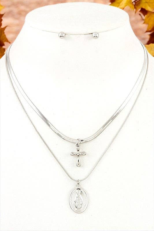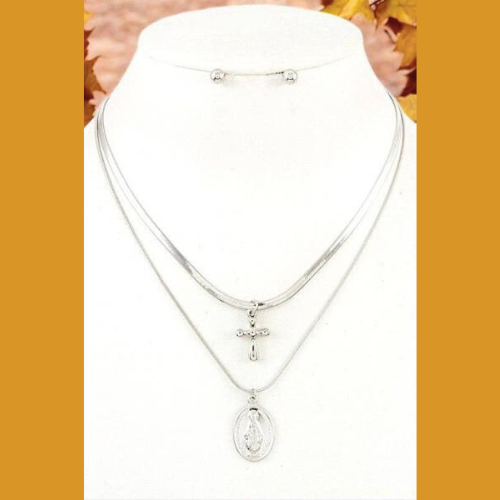 HERINGEBONE CHAIN RELIGIOUS DOUBLE PENDANT NECKLACE AND BALL POST EARRING SET, APPROX LENGTH: 12" 15"